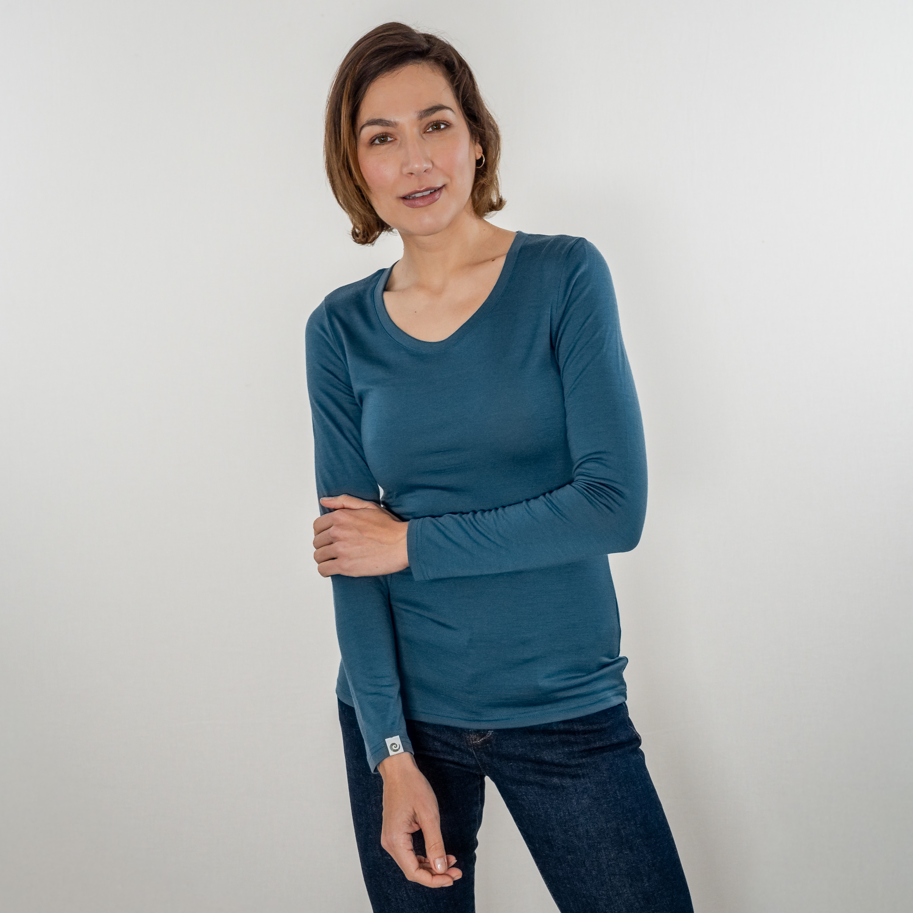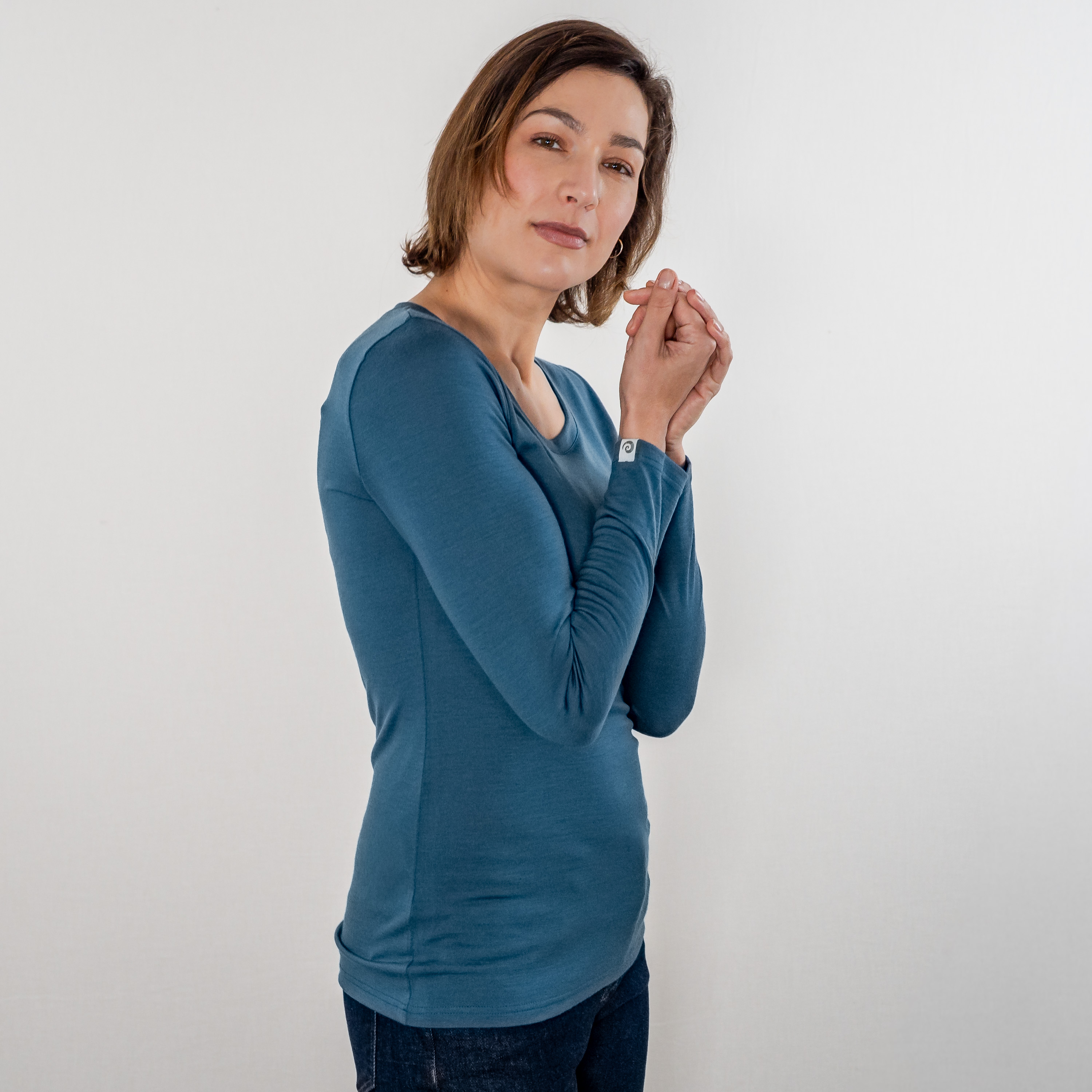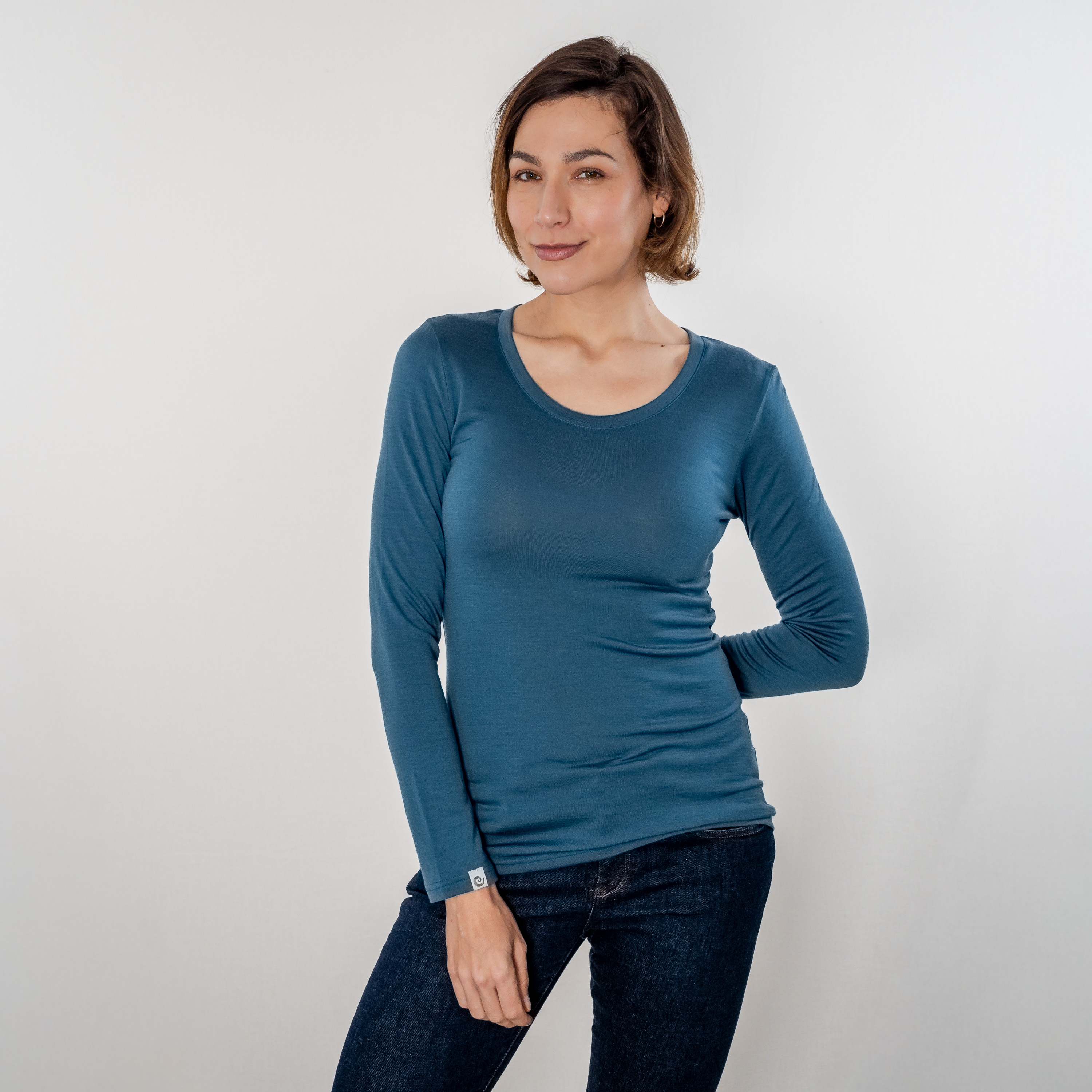 Das Merino Longsleeve Damen Slim Fit 200 mit weitem Rundhals aus reiner Merinowolle vereint höchste Qualität, modernes Design und funktionelle Eigenschaften in einem vielseitigen Kleidungsstück. Hergestellt in Deutschland aus ZQ-Merino-zertifizierter Merinowolle steht es für Nachhaltigkeit, Tierschutz und hervorragenden Tragekomfort.